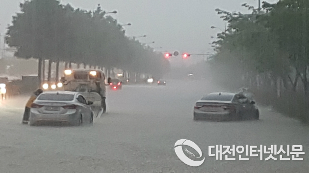 대전지역에 홍수주의보가 발령된 가운데 저지대에 빗물이 고이면서 운행 중이던 자동차가 침수로 고립되고 당황한 운전자들의 우왕좌왕하는 모습과 갈 곳 없는 차량들로 인해 도로는 마치 전쟁터를 연상케할 정도로 아바규환을 이루었다.