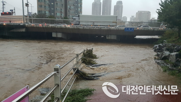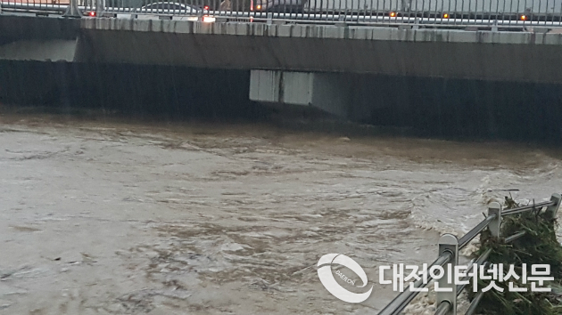 대전. 유성 구암역 인근의 구암교가 상부교각까지 물에 잠기며 범람의 위기를 맞고 있다. 오전 07시경. [사진-대전인터넷신문]