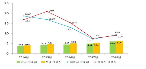 | ▲최근 5년 평균 개별공시지가 상승률(세종시 13.96%,전국5008%) |