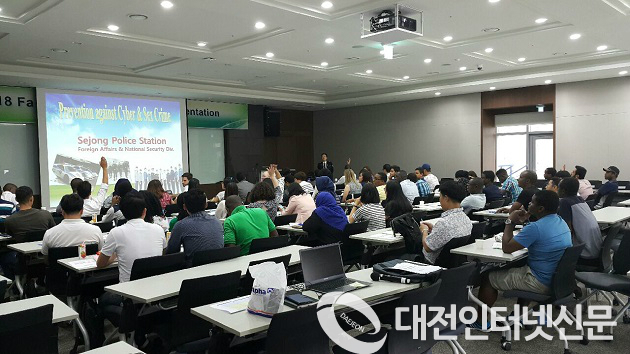 세종경찰서(서장 김정환)는 8. 30. 오후 세종시 남세종로에 위치한 KDIS 국제정책대학원 4층 링컨 홀에서 세계 50여 개국에서 온 박사 과정에 입학한 외국인 대상으로 사이버 사기, 온라인상 성범죄, 횡령 및 절도 등에 관한 범죄예방 교육을 실시하였다.