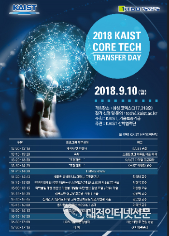 KAIST는 10일 오후 1시부터 서울 삼성동 코엑스에서 산학협력단(단장 최경철) 주관으로`2018 KAIST 핵심 특허기술 이전 설명회´를 개최한다고 3일 밝혔다. 이 설명회는 KAIST 연구진이 보유한 우수 기술을 기업에게 이전을 통해 일자리 창출은 물론 기업 경쟁력을 높이는 산학협력 모델을 조성키 위해 마련됐다.