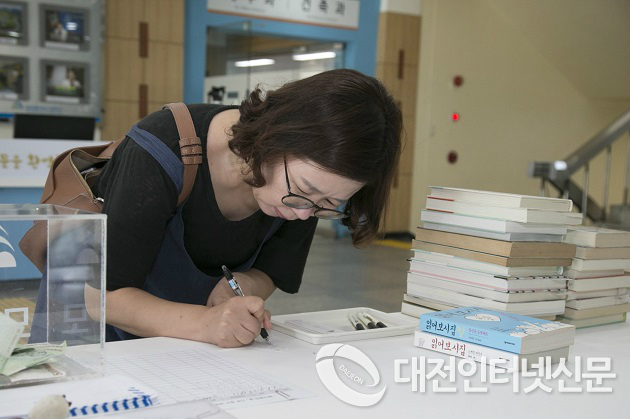 ▲ 5일 대덕구청에서 열린 희망사다리 책 나눔의 날 행사에 참석한 대덕구청 직원이 책갈피에 희망의 메시지를 적고 있다.(사진제공-대덕구청)