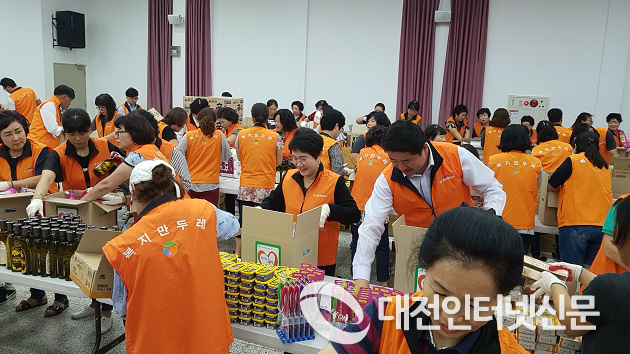 복지만두레대덕구협의회(회장 이근명)가 지난 6일 각 동 회원 등 240여 명이 참여한 가운데 대덕구청 청렴관에서 저소득가정 지원을 위한 행복꾸러미 행사를 열었다.