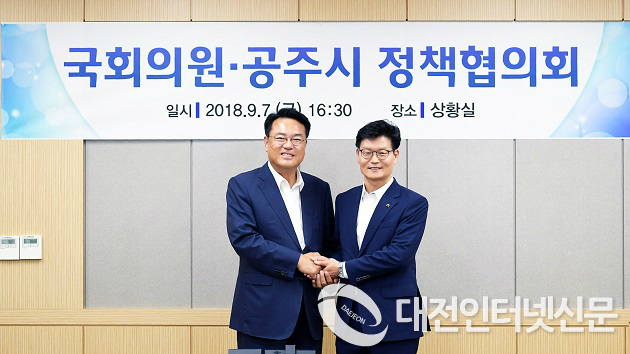 공주시(시장 김정섭)가 7일 시청 회의실에서 정진석 국회의원과의 정책협의회를 열고 국가예산 확보 협조 등 공주시 주요 현안사업 해결을 위한 국회 차원의 적극적인 관심과 지원을 요청했다.