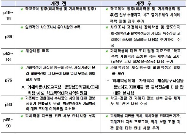 또한, 학교폭력 피해학생 보호 및 지원을 위해 전국에 설치된 피해학생전담지원기관을 안내하고, 지원받을 수 있는 방법을 수록하였고, 아울러, 「학교 안팎 청소년 폭력 예방 보완 대책(`18.8.31)」에 포함된 학교-경찰 간 가해자 정보 신속 공유 체계도 및 관련 내용 등도 반영하였다. 기존에는 경찰에서 수사중인 사안에 대한 정보공유가 원활하지 못해, 학교현장에서 가해학생에 대한 조사에 어려움을 호소해왔다.