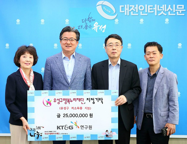대전 유성구(구청장 정용래)는 12일 KT&G 상상펀드 기금운영위원회(위원장 김외현)가 유성구행복누리재단에 후원금 2,500만원을 기탁했다고 밝혔다.