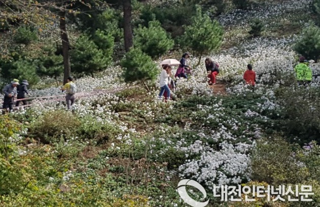 작년 구절초 축제를 방문한 방문객들이 사사를 중심으로 흐드러지게 만개한 구절초 속에서 동심을 만끽하고 있다. [사진- 17년 대전인터넷신문 최대열 기자]