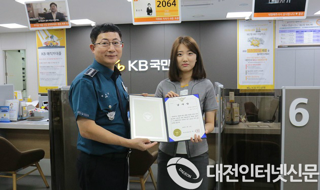 국민은행 크로바지점 최유지 대리는 지난 8월 9일 국민은행 계좌에서 돈을 모두 현금으로 인출하려는 고객을 발견하고 보이스피싱 범행으로판단, 신속히 경찰에 신고하였다.