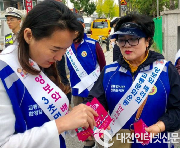 이날 대전화정초등학교 학생과 학부모 주변 상가주민들에게 교통안전 일회용 홍보벤드, 교통안전 홍보 전단지 등 홍보 물품을 전달하는 등 어린이 교통안전홍보활동도 병행 실시했다.