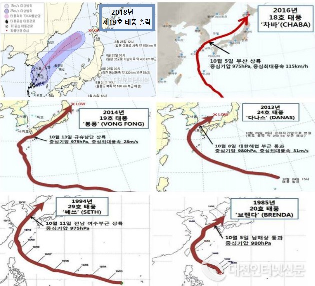 과거 10월 우리나라에 영향을 준 태풍과 지난달 남해안에 상륙한 제19호 태풍 솔릭의 이동경로. [태풍경로-기상청]