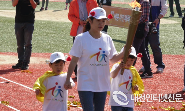▲성화봉송 첫 주자인 아동들이 보호자와 함께 성화를.... [사진-대전인터넷신문]