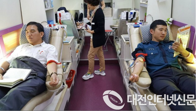 | ▲대전 둔산경찰서 직원들이 부족한 혈액수급에 도움을 주고자 자발적으로 헌혈 봉사에 동참하여 따뜻한 사랑 나눔을 실천하고 있다(사진-대전청) |