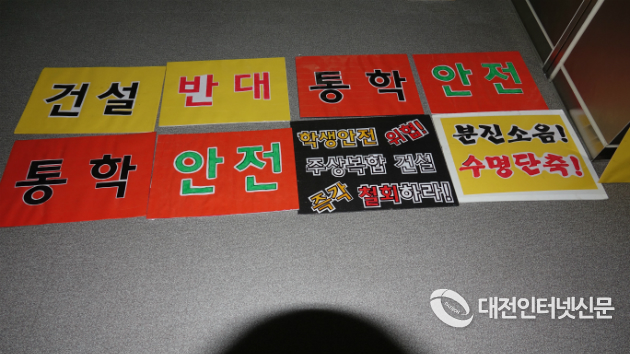 | ▲ 교육환경평가가 이루어지는 세종교육청 3층 바닥에는 학부모들의 요구 피켓이.... [사진-대전인터넷신문] |
