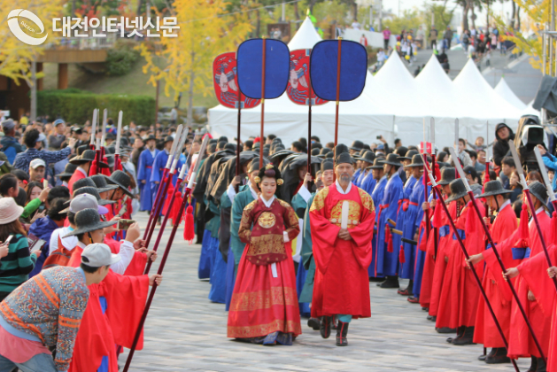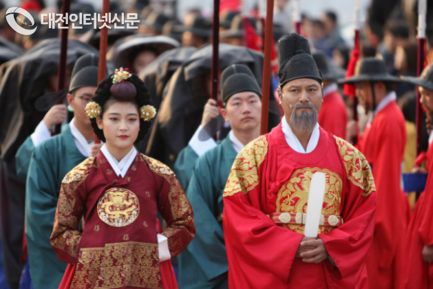 세종대왕 즉위 600주년을 기념하기 위해 재현된 세종어가행렬에서 세종시민 중 선발된 세종대왕과 소현왕비가 입장하는 모습. [사진-대전인터넷신문]