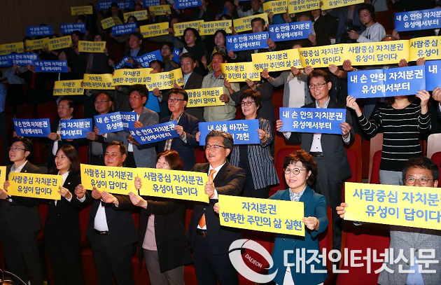 | ▲10일 유성구청소년수련관에서 열린 민선7기 출범 100일 기념 사이多토크콘서트에서 참석한 주민들이 자치분권 선도 다함께 퍼포먼스를 하고 있다.(사진-유성구) |
