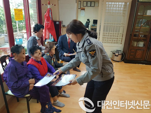 ▲유성경찰서는 유성구 진잠동 소재 원내1통 경로당을 방문하여 보행자 교통사망사고 예방활동을 실시했다(사진-대전청)