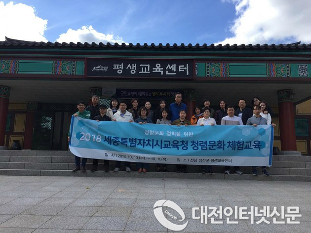 세종특별자치시교육청(교육감 최교진)은 10일과 11일 이틀 동안 전남 장성군 일원에서 관내 각급학교와 본청 직원 20여 명을 대상으로 선현들의 청렴한 생활을 체험과 시대가 요구하는 공직자 정신을 생각해볼 수 있는 시간「2018 청렴문화 체험교육」을 실시했다고 밝혔다.