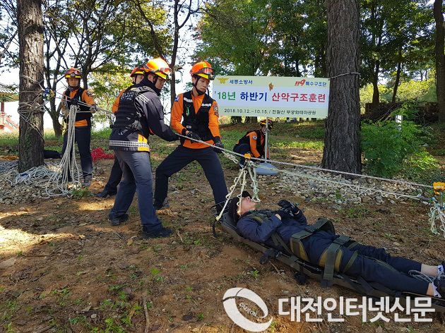 | ▲12일 전월산에서 진행된 `2018년 하반기 산악구조훈련´에서 세종 119특수구조단 구조대원들이 산악용 들것을 이용, 요구조자를 이송하는 훈련을 하고 있다. (사진제공-세종시청) |