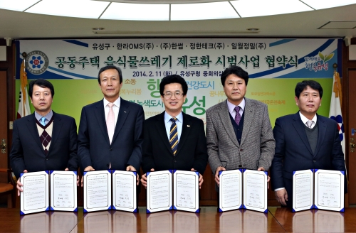 유성구(구청장 허태정)는 11일 구청 중회의실에서 한라OMS(주) 및 (주)한썸, 정한테크(주), 일월정밀(주) 관계자 10여 명이 참석한 가운데 공동주택 음식물쓰기 제로화 시범사업을 위한 업무협약을 체결했다.