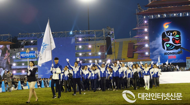 천년의 도시 전북 익산시에서 개최된 제99회 전국체전 개막식에서 세종특별자치시 선수단이 15번째로 위풍당당하게 입장하고 있다. [사진-대전인터넷신문]
