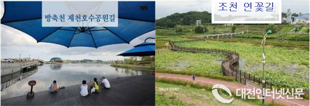 국토교통부(장관 김현미)는 우리나라 하천을 조망하며 거닐 수 있는 탐방로 중 경관․생태환경이 우수하고, 역사유적지 및 관광문화시설을 관람 할 수 있는 길을 엄선하여 `아름다운 우리강 탐방로 100선´에 대전광역시 금강 로하스해피로드(3Km), 탄동천 물향기숲향기길(14.8km)와 세종특별자치시 소재 방축천, 제천 호수공원길(11.5km), 조천 연꽃길(1.6km)를 선정했다.