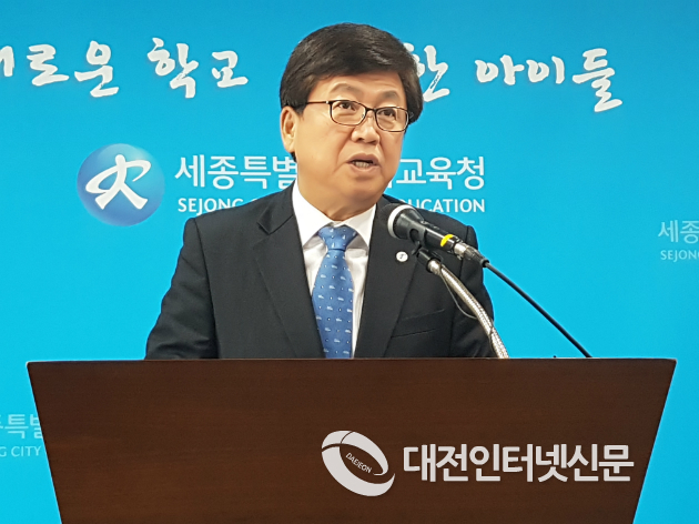 최교진 세종시교육감이 16일 정례브리핑을 통해 조치원여중과 조치원중학교를 남여공학으로 통폐합하고 당초 이전게획보다 1년 앞서 21년 개교할 계획을 밝히고 있다. [사진-대전인터넷신문]