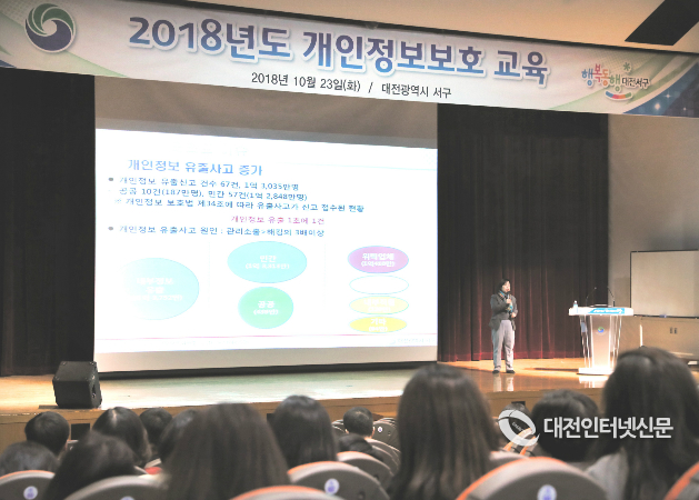 대전광역시 서구청이 23일 서구청 대강당에서 직원 400여 명을 대상으로 공공기관의 개인정보유출 사고를 사전에 예방하고, 직원들의 정보보안과 개인정보보호 마인드 인식 제고를 위한 `2018년도 개인정보보호 교육´을 실시했다.