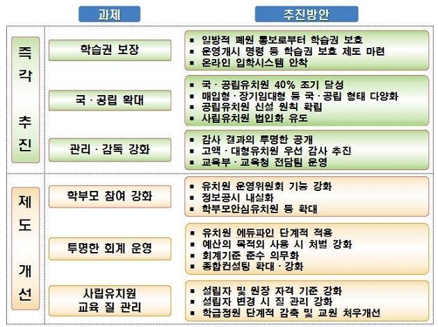 당정은 즉각 추진과제로 ▲유아의 학습권 보장, ▲국공립 유치원 확대, ▲유치원 관리·감독 강화를, 제도 개선과제로는 ▲학부모 참여 강화, ▲투명한 회계 운영, ▲사립유치원 교육의 질 개선 방안에 합의하였다.