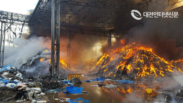 | 세종시 전동면 송성리 00환경 재활용품 선별장에서 발생한 화재로 선별장 660제곱미터가 소실되었다. [사진-세종소방본부] |