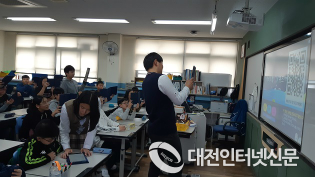 | ▲ 전의중이 지난 2017학년도부터 2년간 세종시교육청 지정 디지털교과서 정책 연구학교를 운영 중이다. 사진은 디지털교과서를 이용한 과학 체험교실 장면. (사진제공-세종시교육청)
