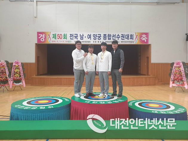 | ▲ 공주시청 양궁팀(왼쪽부터) 민태흥,박규석,최재환 선수(맨오른쪽) 박 경모 감독(사진제공-공주시청) |