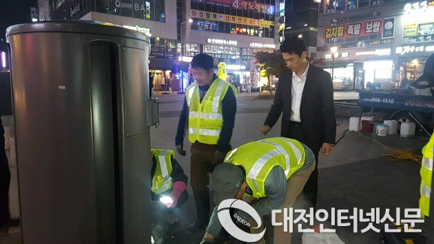 ▲ 도담동 상가지역 자동크린넷에 대한 청결 청소작업을 실시하는 자리에 노종용 세종시의원이 참석하여 관계자들을 격려하고 자동크린넷의 깨끗한 이용을 위한 시민들에게 자발적인 참여를 당부했다.(사진제공-세종시청)