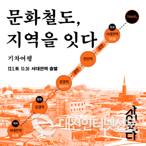 대전시는 오는 12월 1일 2018. 문화가 있는 날 지역특화사업 `사絲, 이異 잇다´의 마지막 프로그램으로, 철도로 인해 희비가 엇갈렸던 두 지역 대전과 강경을 잇는 기차여행`문화철도, 지역을 잇다´를 개최한다고 8일 밝혔다.