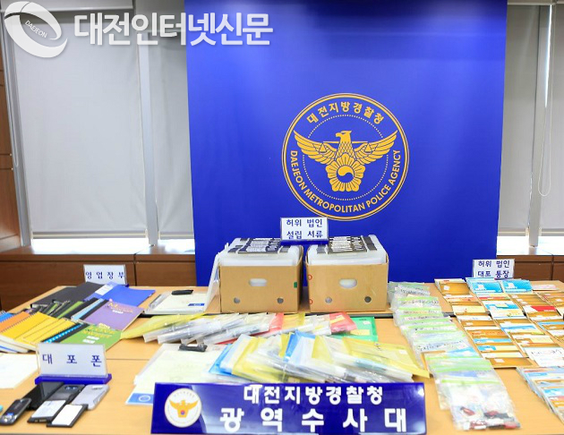 | ▲경찰이 압수한 허위 법인설립 서류와 물품들...(사진-대전청) |