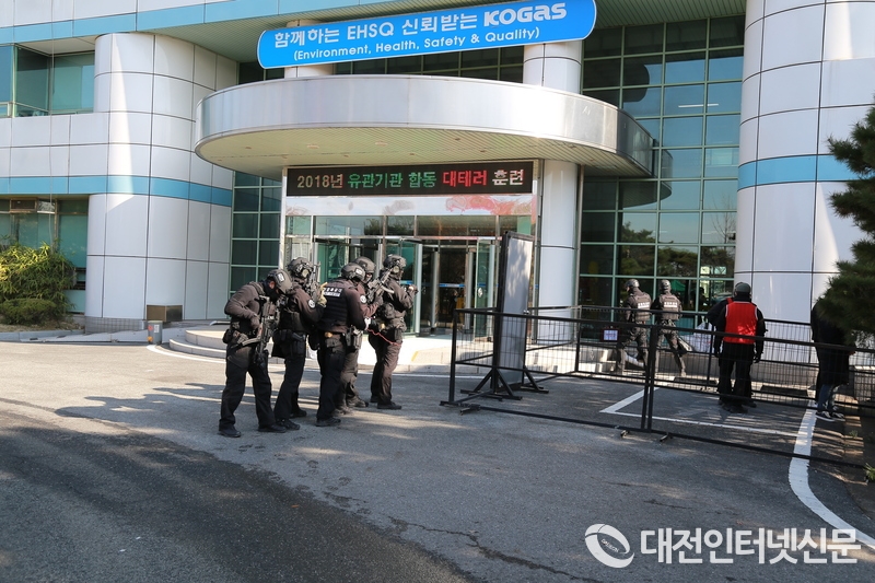 대전중부경찰서(서장 안태정)는 11월 23일 14시, 각종 테러위협에 대비하고 위기관리 대응역량 강화를 위해 중촌동‘한국가스공사 대전충청본부’에서 소방서, 32사단 화생방지원대, 제505여단 5대대, 금강유역환경청, 한국가스공사 등 6개 유관기관 82명이 참석한 가운데 합동훈련을 실시하였다.