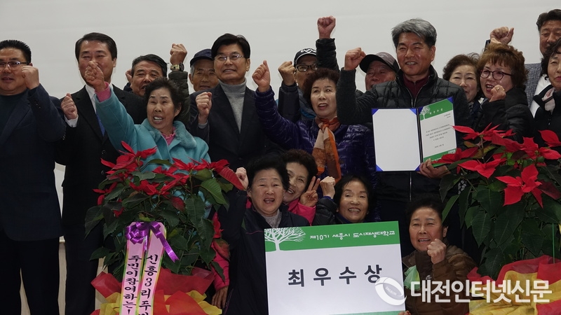 제10기 세종도시재생대학 수료식에서 최우수상을 수상한 신흥3리 주민들이 이춘희 세종시장과 함께 도시재생대학 파이팅을 외치고 있다. [사진-대전인터넷신문/최 대열 기자]