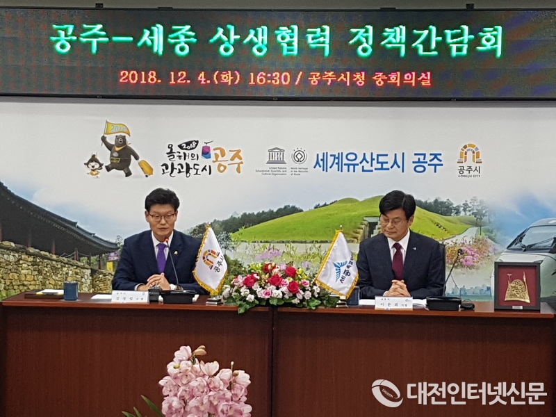 세종시는 4일 공주시청에서 이춘희 세종시장과 김정섭 공주시장이 참여한 가운데 첫 번째 정책간담회를 열고, 세종-공주 간 상생협력 추진의지를 재확인했다.