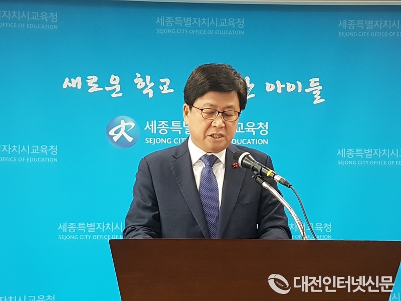 18일 정례브리핑을 통해 2019년 세종시 중·고교 신입생 무상교복 지원에 대해 그간의 경과와 지원절차를 설명하는 최교진 세종시교육감. [사진-대전인터넷신문/박미서기자]