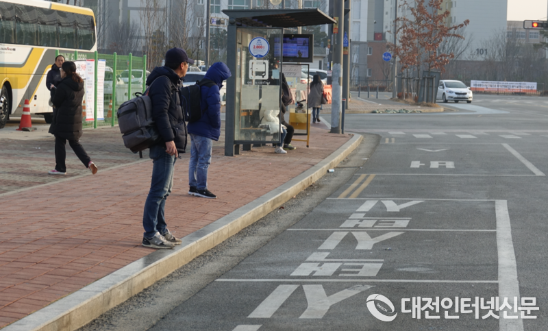 19일 아침 출근을 서두르는 공무원으로 짐작되는 사람들이 세종터미널에서 없는 택시를 기다리며 추위에 떨고 있다. [사진-대전인터넷신문]