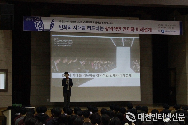 26일 세종국제고 강당에서 김태원 구글코리아 상무가 학생과 교직원을 대상으로 강연을 펼치고 있다.(사진제공=세종시교육청)