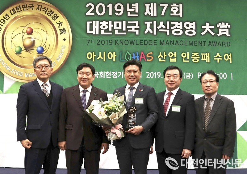 대전광역시의회 김종천 의장이 2019년 제7회 대한민국 지식경영대상을 수상의 영예를 안고 동료의원들과 함께 뻐하고 있다.(사진=대전시의회)