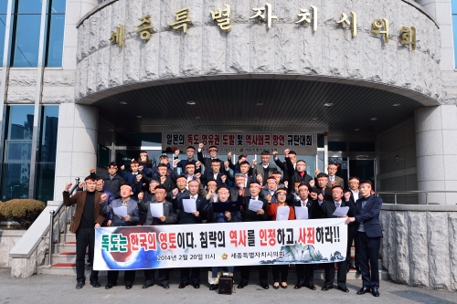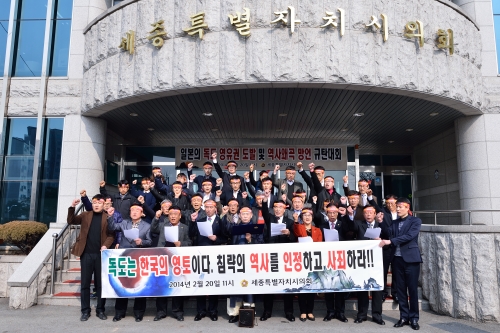 세종특별자치시의회(의장 유환준) 의원과 의회사무처 직원 등 40여명은 20일 11시 세종시의회 현관 앞에서 일본의 독도 영유권 도발 및 역사왜곡 망언 규탄대회를 가지고 성명서를 발표하였다.