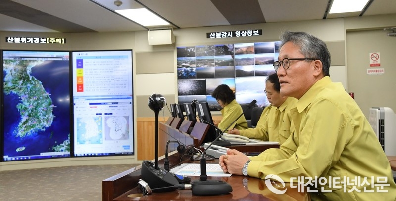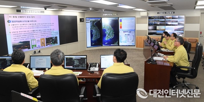 김재현 산림청장(왼쪽에서 네번째)이 1일 정부대전청사 산림청 중앙산불방지대책본부에서 봄철 산불방지 중점 대책에 대해 보고 받고 있다.<사진=사진=산림청 제공>