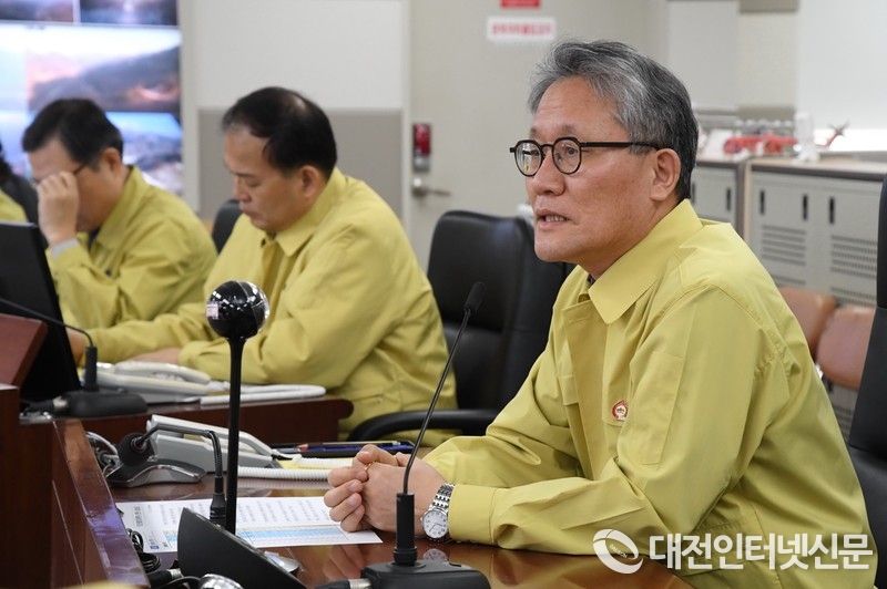 김재현 산림청장(오른쪽 첫번째)이 1일 정부대전청사 산림청 중앙산불방지대책본부에서 봄철 산불방지 중점 대책에 대해 보고 받은 뒤 산림항공 안전과 산불로 인한 인명사고가 없도록 산불대응에 만전을 기해 주길 당부하고 있다.<사진=산림청 제공>