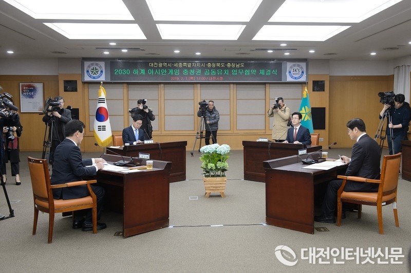 오늘 2019년 2월 7일 오전 대전시청에서 충청권 4개 시·도 지사는2030 아시안게임 공동유치 업무협약을 체결하고 2030 아시안게임 공동유치로 인하여 충청권이 비로서 대한민국을 넘어 아시아의 중심으로 도약하는 기회로 삼아 560만 충청인의 염원과 역량을 한데 모아 적극적인 공동유치에 나서기로 했다.