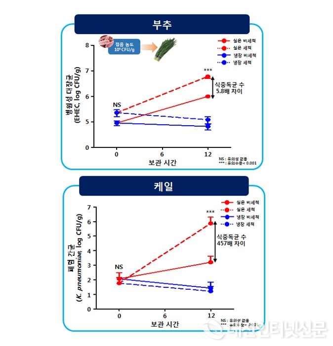 반면 부추‧케일 모두 세척하지 않고 실온에 12시간 보관한 경우 식중독균 또는 유해균의 분포 변화가 관찰되지 않았다고 밝혔다.