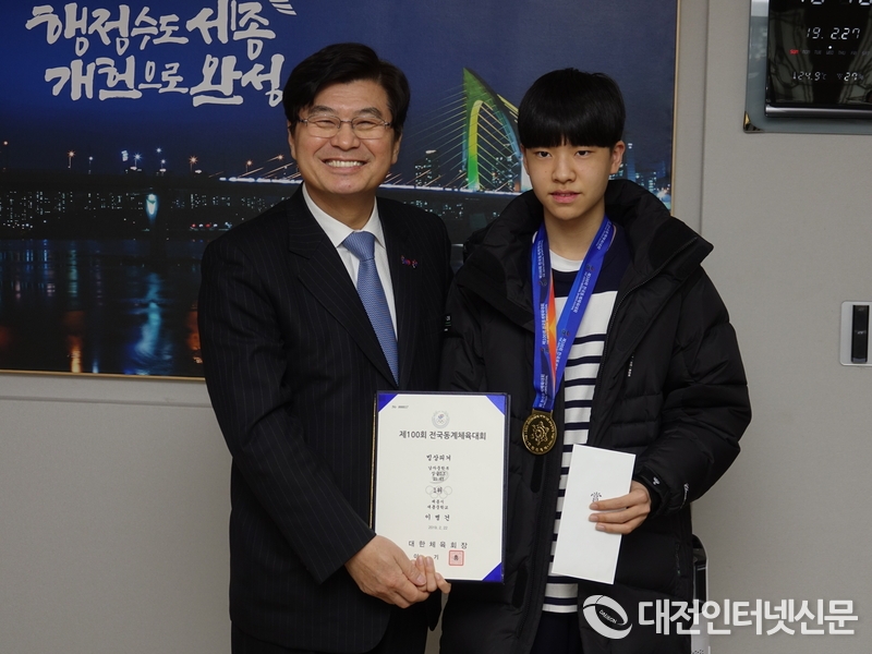 빙상 피겨종목 남중부 싱글D조에 출전 금메달을 획득한 이병건(새롬중 3) 선수와 이춘희 시장이....[사진-대전인터넷신문]