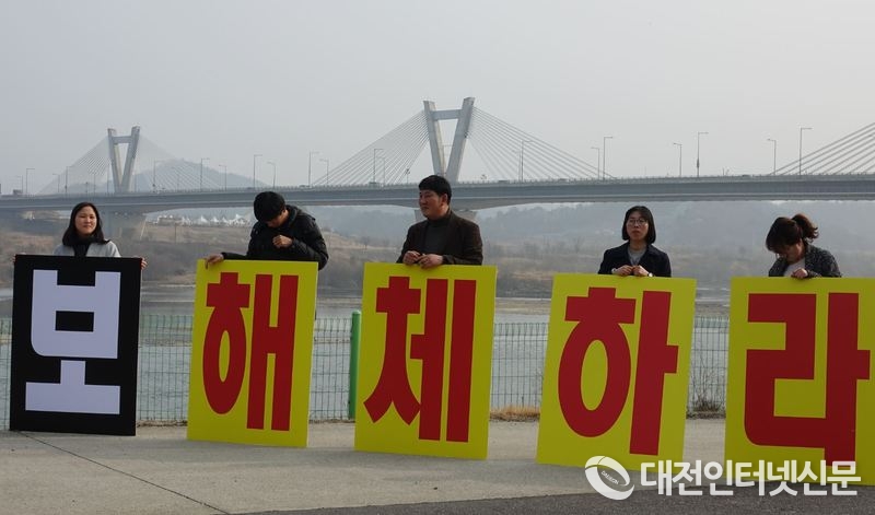 4일 오후 세종보를 방문한 자유한국당 의원들의 보 유지에 대해 환경을 위해서는 세종보는 해체되는 것이 맞다고 주장하는 환경단체 회원들. [사진-대전인터넷신문]