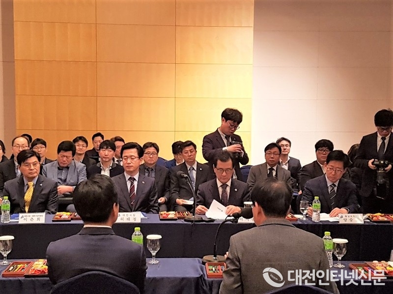 [대전 인터넷신문=세종/최대열 기자] 더불어민주당 충청권 4개 시·도당 및 광역지자체가 7일 오전 11시 청주 그랜드플라자청주호텔에서 ‘제1차 더불어민주당 충청권 당정협의회’를 개최하였다. 이 자리에서 충청권 4개 시·도당 및 광역지자체는 ▲2030 아시안게임 충청권 공동 유치, ▲미세먼지 공동 대응, ▲충청권 광역교통체계 구축, ▲4차산업혁명 충청권상생벨트 구축 등 4가지 공동주제를 폭넓게 논의하고 공동대응하기로 합의했다.