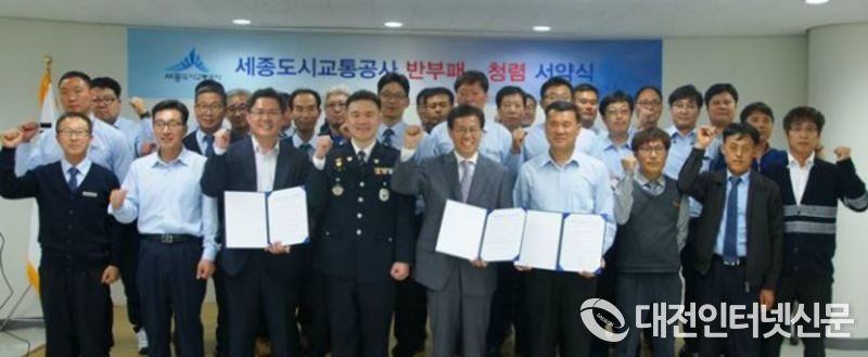 세종특별자치시 산하에 설립된 국내 최초 버스 중심 공기업인 세종도시교통공사가 지난 17년 4월 28일 어진동 복합커뮤니티센터에서 ▲ 첫째, 나는 법과 원칙을 준수하고 부패를 예방함으로서 청렴한 직장 구현을 위해 솔선수범 한다. ▲ 둘째, 나는 사익보다 공익을 우선하며 업무수행 과정에서 부당한 이익을 추구하지 않는다. ▲ 셋째, 나는 직위를 이용한 지위 ‧ 권한남용, 이권 개입, 알선 ‧ 청탁을 하지 않는다. ▲ 넷째, 나는 어떠한 경우에도 금품·향응을 받지 않으며, 청렴성에 의심을 받을 만한 일체의 행동을 하지 않는다. ▲ 다섯째, 나는 외부의 부당한 간섭을 철저히 배제함으로서 조직 구성원들이 소신 있게 일할 수 있도록 노력한다. 등의 5개 반부패․청렴 서약식을 개최하는 모습. [사진-대전인터넷신문 자료 중]